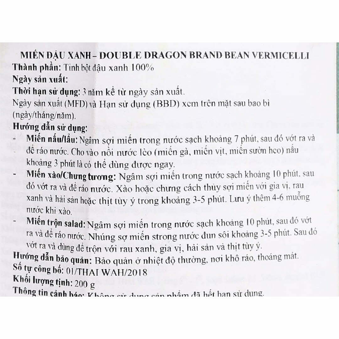 Miến Đậu Xanh Double Dragon Thai Wah sợi miến tròn, nhỏ, màu trắng được làm từ tinh bột đậu xanh. Miến đậu xanh Double Dragon Thai Wah gói 200g rửa kỹ, ngâm nước là có thể đem ra chế biến với những món ăn yêu thích của bạn. Miến Thai Wah chất lượng, được nhiều người tin dùng và dễ bảo quản