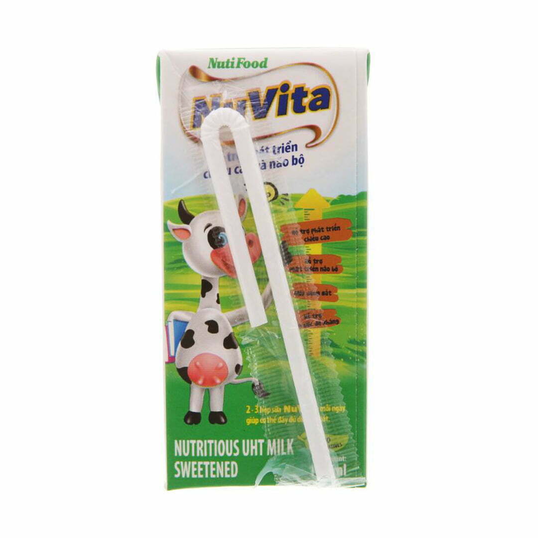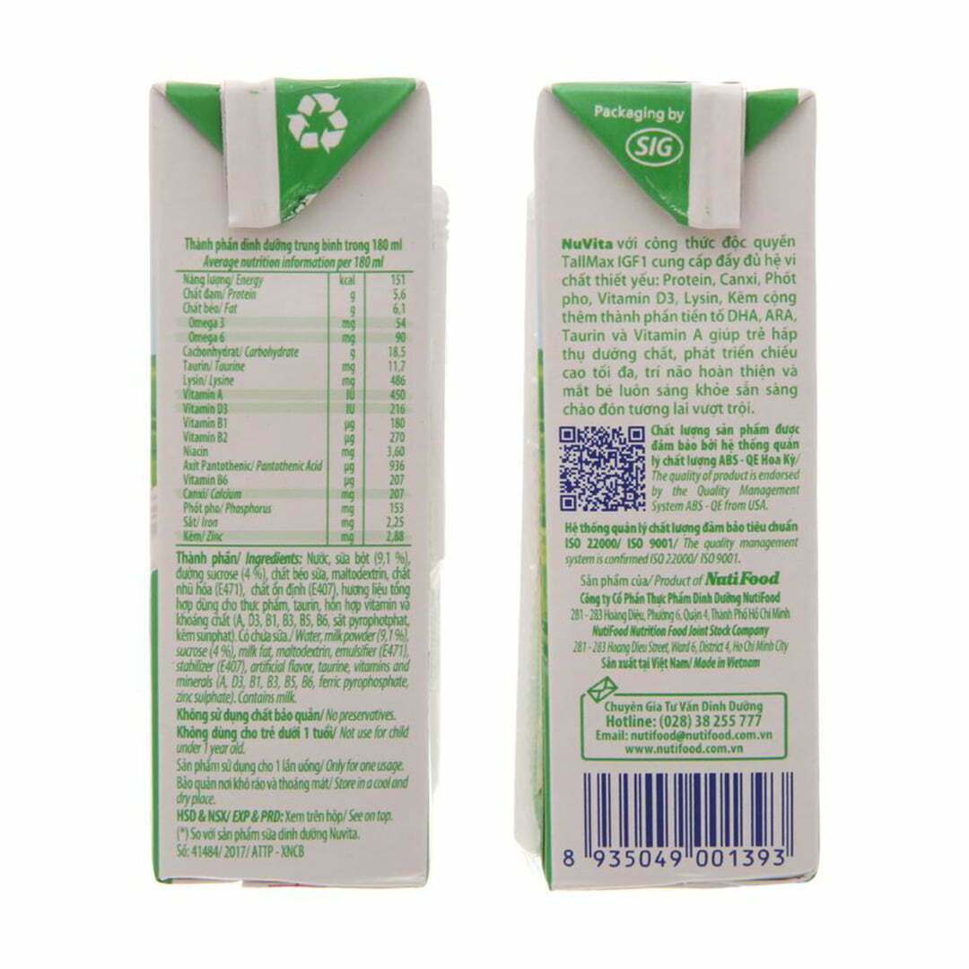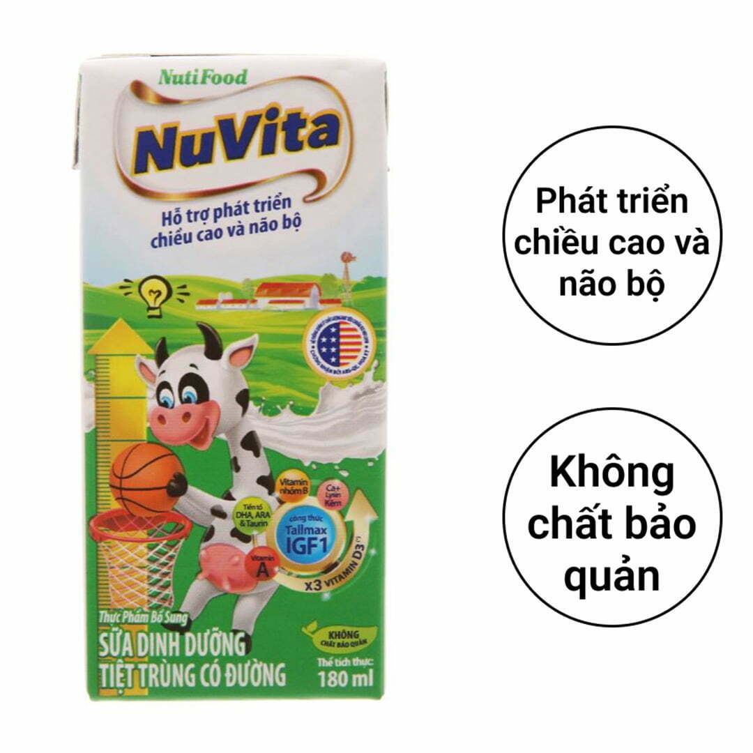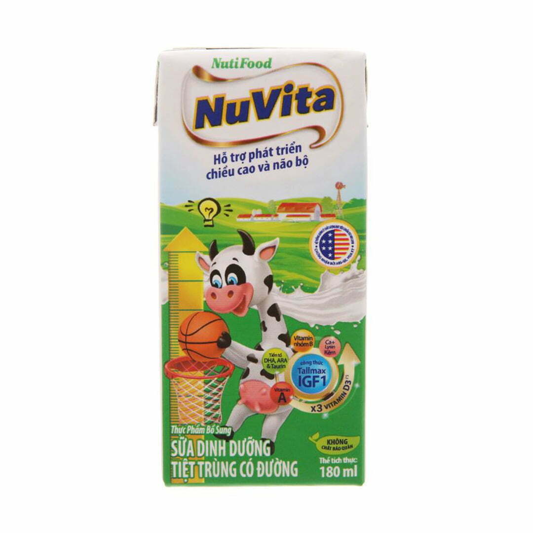 Là sản phẩm sữa tươi giúp hỗ trợ phát triển chiều cao và trí não hiệu quả. Sữa tươi Nuvita chứa công thức Tallmax IGF1 bổ sung tiền tố DHA, ARA và Taurin, vitamin nhóm B, Canxi, Lysin, kẽm và gấp 3 lần vitamin D. Thùng 48 hộp sữa tiệt trùng có đường Nuvita 180ml thơm ngon, dễ uống