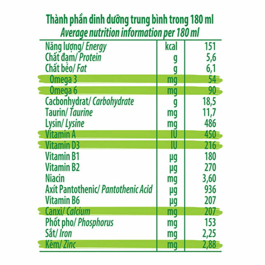 Thành phần Nước, sữa bột (9,1%), đường sucrose (4%), chất béo sữa, maltodextrin, hương liệu tổng hợp dành cho thực phẩm, taurin, hỗ hợp vitamin và khoáng chất (A, D3, B1, B5, B6, sắt pyrophosphat, kẽm sulphat). Có chứa sữa.